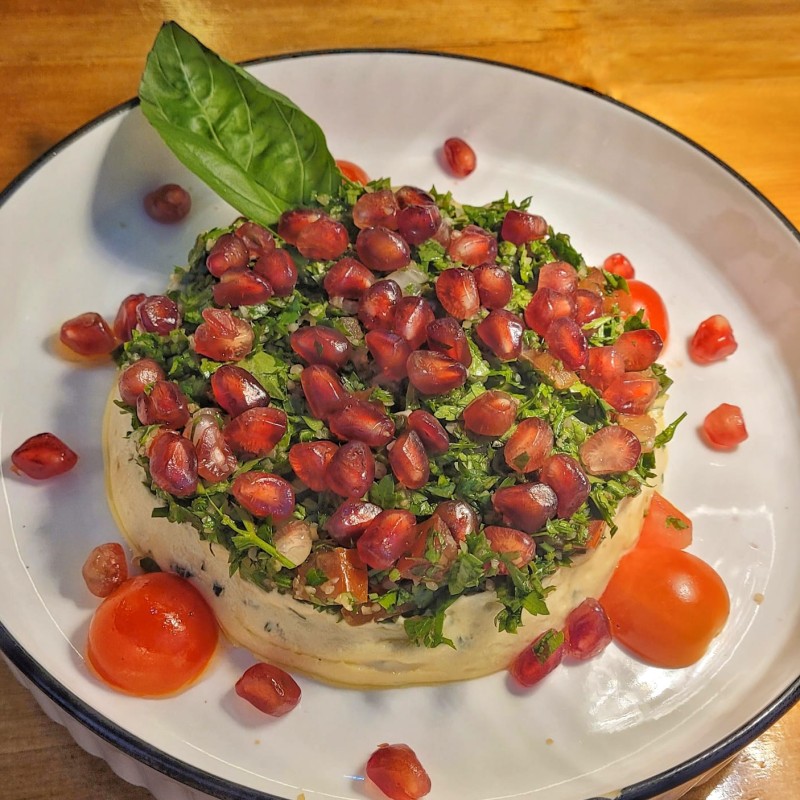 (150 سعرة حرارية)الحمص المهروس والطحينة مع توابل خاصه، يقدم مع الخبز الطازج