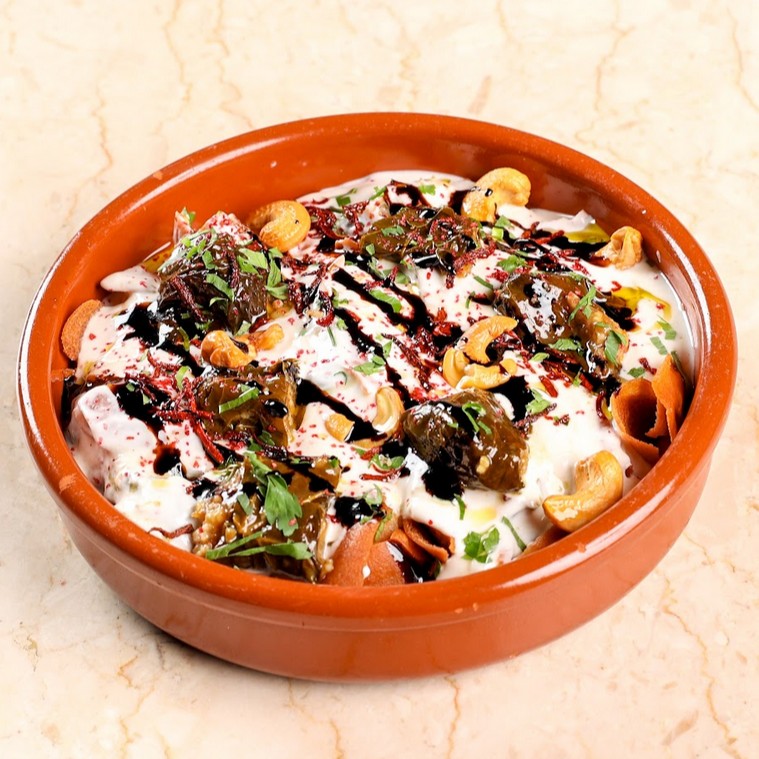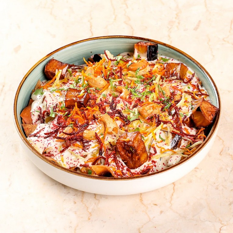 (279 سعرة حرارية)مكعبات الباذنجان والبطاطا المقلية مع مزيج صوص الزبادي والطحينه